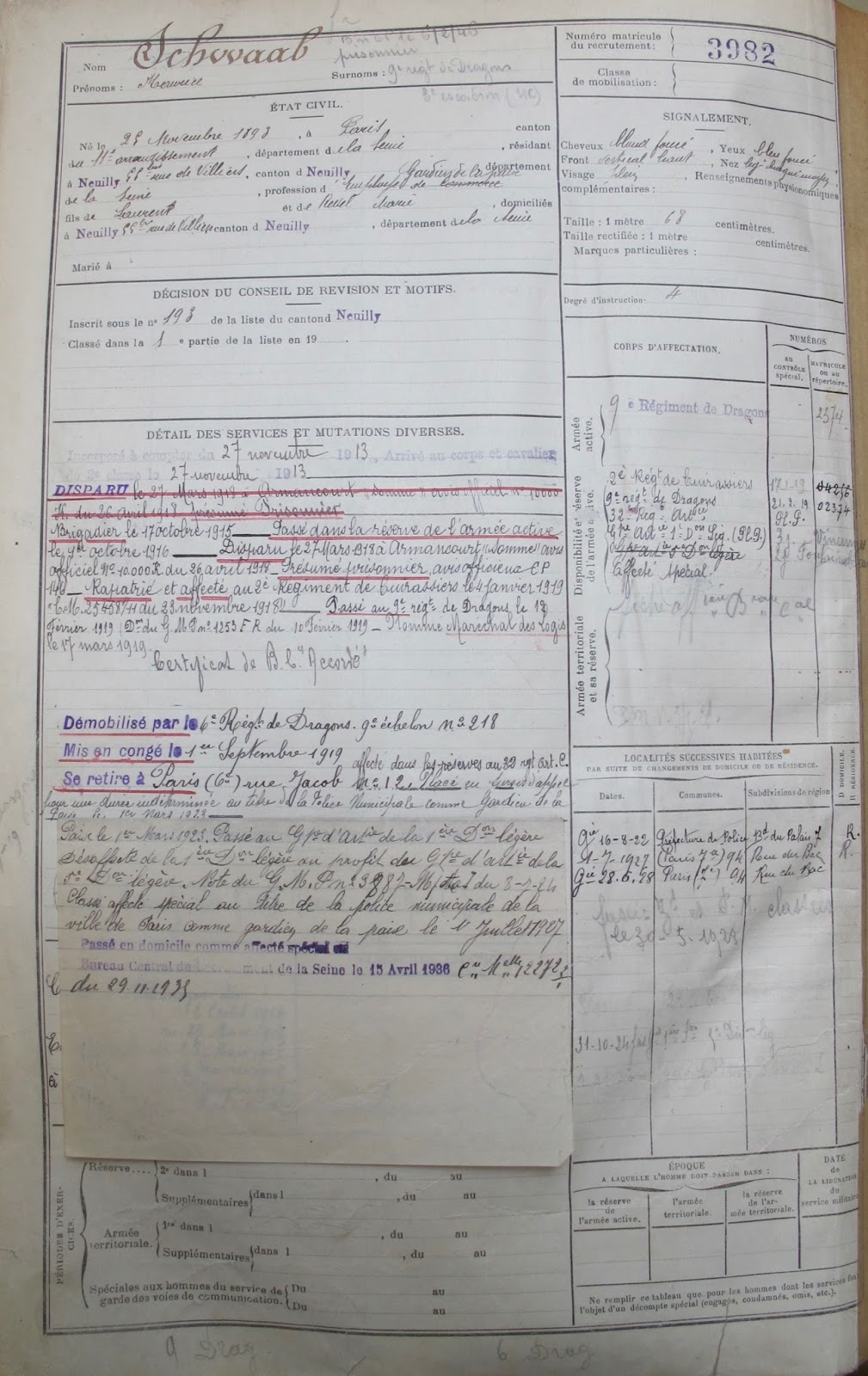 A la lecture de sa fiche matricule (consultée lors d\’une précédente visite aux AD de Paris, le 18 août 2015, pour être précis), j\’ai appris qu\’il était gardien de la paix, et qu\’il a résidé à Paris au 12 rue Jacob dans le 6è arrondissement, puis au 94 rue du Bac dans le 7è arrondissement.