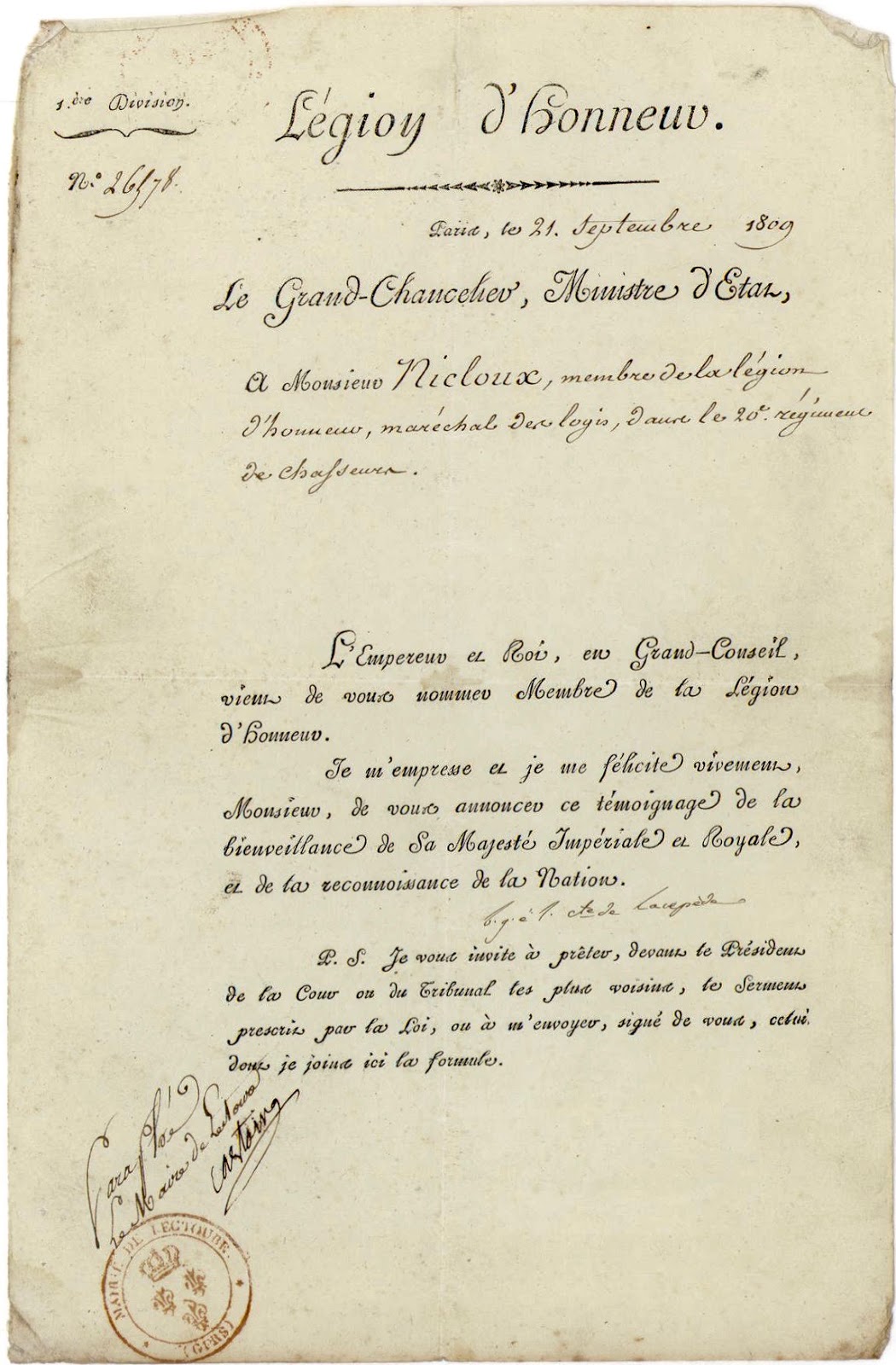 D\’une visite sur le site Léonore (base de données de la Légion d\’Honneur) je découvre que Dominique Louis NICLOUX avait été promu chevalier de la Légion d\’Honneur le jeudi 21 septembre 1809, par Bernard Germain Etienne de Laville-sur-Illon, comte de Lacépède (1756-1825)
