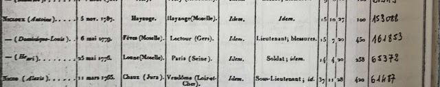 Une première visite au Service Historique de la Défense à Vincennes jeudi dernier 28 avril 2016, m\’indique, en consultant le volume 10 des pensions militaires 2Yf de la période 1801-1817, qu\’il percevait une pension annuelle de 450 francs au titre de son grade de lieutenant et au titre des blessures reçues lors d\’une carrière militaire longue de 15 ans 7 mois et 20 jours.