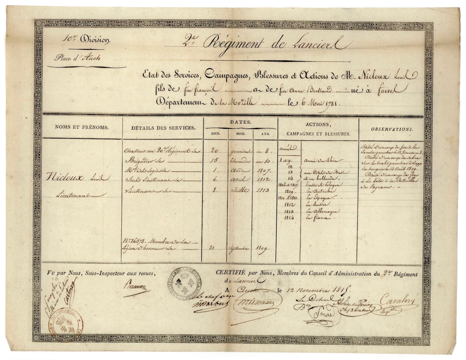 qu\’il était lieutenant au 2e régiment de lanciers, et que lors de ses nombreuses campagnes militaires à travers l\’Europe (Hollande, Prusse, Pologne, Autriche, Espagne, Russie et Allemagne) il avait été blessé à trois reprises, coups de feu à la jambe gauche et à la tête, coup de sabre au bras gauche.