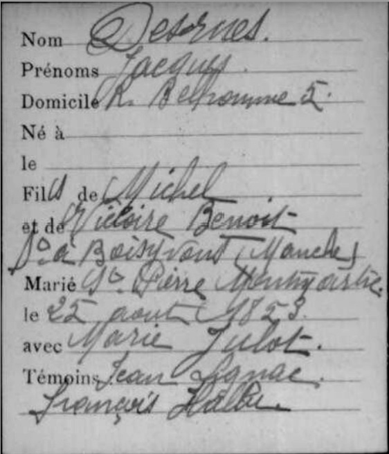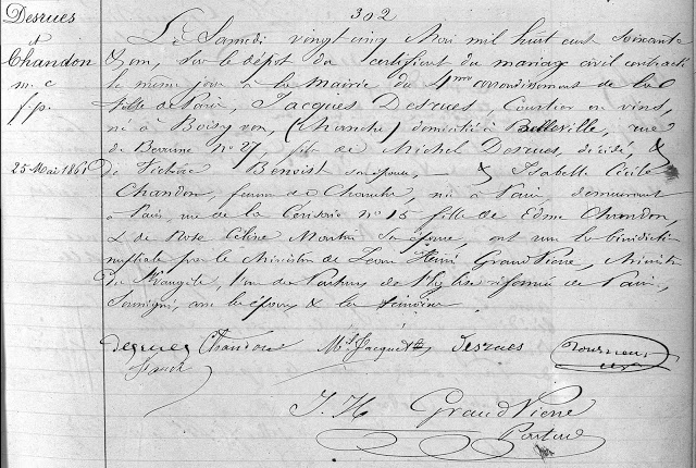 Peu de temps après le décès de son épouse, Marie Françoise JULOT décédée le 27 décembre 1860, Jacques DESRUES se remarie avec Isabelle Cécile CHANDON à la mairie du 4e arrondissement de Paris, le 25 mai 1861, elle était femme de chambre et habitait 15 rue de la Cerisaie.