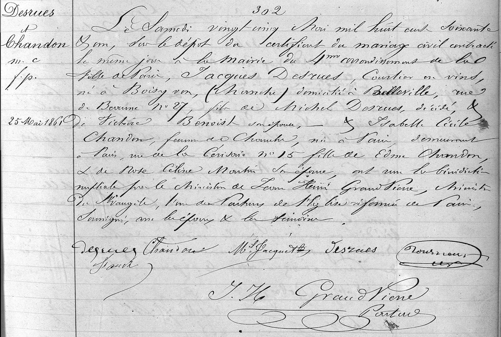| Mariage DESRUES CHANDON – Acte n° 302 (page 132/401) |