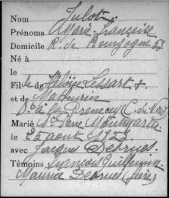 Le troisième, sur le site des Archives de Paris, dans la rubrique de l\’état civil reconstitué, mariages DESRUES entre 1808 et 1859 (cote V3E/M305) concerne le même mariage du 25 août 1853 entre Jacques DESRUES et Marie Françoise JULOT, mais ne sont cités ni les parents ni les témoins.