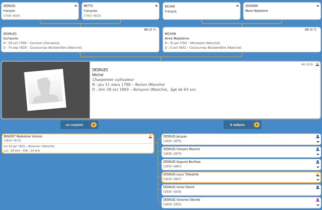 Jacques, né le 20 janvier 1826 à Boisyvon (50), était donc l\’ainé d\’une fratrie de 6 enfants, frère de mon arrière-arrière-grand-père Louis Théophile DESRUES ( 1834 – 1867).