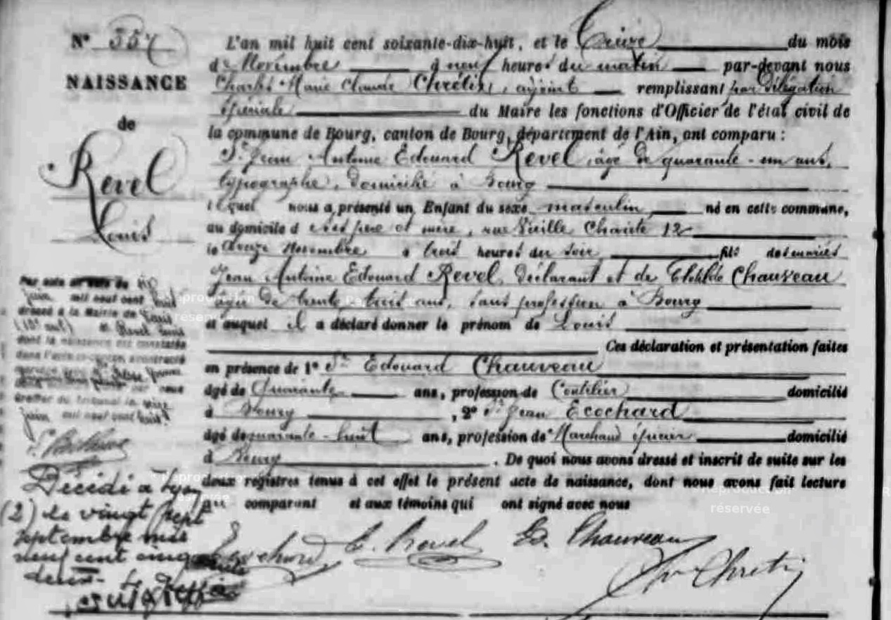 Il y a 140 ans, le 13 novembre 1878 à 9 heures du matin, Jean Antoine Edouard REVEL déclarait la naissance de son fils Louis né le 12 novembre 1878 à trois heures du soir, au domicile de ses père et mère, au 12 rue Vieille Charité à Bourg-en-Bresse .