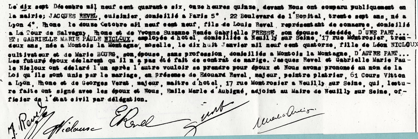 Le dix sept décembre mil neuf cent quarante six, onze heures quinze, devant nous ont comparu publiquement la mairie ; Jacques REVEL, cuisinier, domicilié à Paris 5è, 22 boulevard de l\’Hôpital, trente sept ans, né à Lyon 4è, Rhône, le douze octobre mil neuf cent neuf, fils de Louis REVEL, représentant de commerce, domicilié à La Tour de Salvagny, Rhône, et de Yvonne Suzanne Renée Gabrielle FRESSE, son épouse, décédée, d\’une part ; et Gabrielle Marie Paule NICLOUX, employée d\’hôtel, domiciliée à Neuilly-sur-Seine, 17 rue Montrosier, trente deux ans, née à Montois-la-Montagne, Moselle, le dix huit janvier mil neuf cent quatorze, fille de Léon NICLOUX, cultivateur, et de Marie BOURG, son épouse, sans profession, domiciliés à Montois-la-Montagne, d\’autre part. Les futurs époux déclarent qu\’il n\’a pas été fait de contrat de mariage. Jacques REVEL et Gabrielle Marie Paule NICLOUX ont déclaré l\’un après l\’autre vouloir se prendre pour époux et nous avons prononcé au nom de la loi qu\’ils sont unis par le mariage , en présence de Edouard REVEL, majeur, peintre plâtrier, 61 cours Vitton à Lyon, Rhône, et de Georges VERAT, majeur, maitre d\’hôtel, 17 rue Montrosier à Neuilly-sur-Seine, qui, lecture faite ont signé avec les époux et nous, Emile MERLE D\’AUBIGNÉ, adjoint au maire de Neuilly -sur-Seine, officier de l\’état civil par délégation.